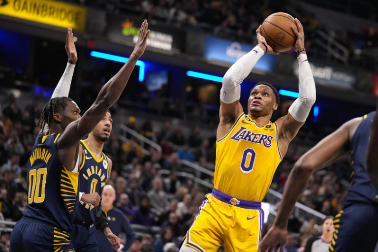 体育新闻:洛杉矶湖人吉祥坊队的拉塞尔威斯布鲁克在盖布里奇球场射杀印第安纳步行者队