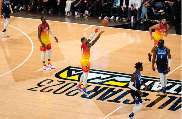 吉祥坊体育新闻:扬尼斯队的达米安·利拉德 (C) 在 NBA 全明星赛对阵勒布朗队的比赛中投进三分球