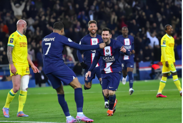 “Ligue 1 Messi 为 Mbappe Pereira 吉祥坊进球,让巴黎在南特以 4-2 领先。”