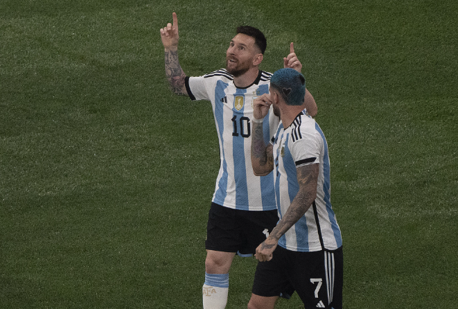 阿根廷队的莱昂内尔·梅西在澳大利亚友谊赛中进球后庆祝