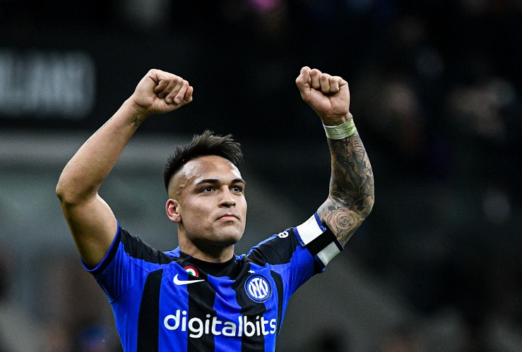 足球新闻:国际米兰队的劳塔罗·马丁内斯在圣西罗球场与 AC 米兰队的比赛后庆祝。